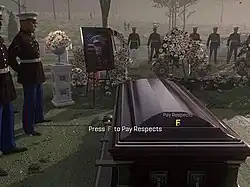 The prompt "Press F to Pay Respects" appears in Call of Duty: Advanced Warfare during a scene where the player character mourns the death of his comrade, who was killed saving his life in battle. When the player presses the key, the character steps forward and places his right hand on his comrade's coffin for several seconds, then turns around to leave.[1]