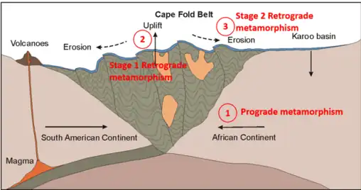 - Retrograde (post-peak) metamorphism: the metamorphism occurred during uplift and cooling of the rock.[3]