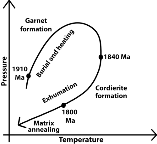 It is commonly observed that the peak temperature is reached prior to the peak pressure in anticlockwise P-T-t paths, as the rocks usually experienced the heat from the heat source before being extensively pressurized.[12]