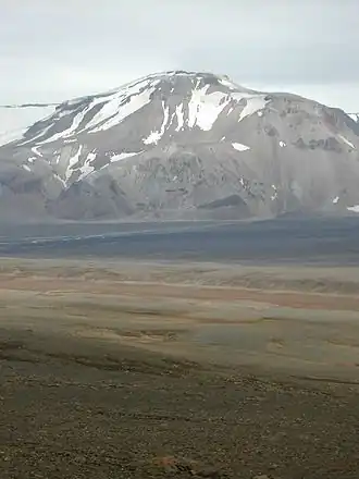 The central volcano Prestahnúkur consists of a rhyolite tuya that was formed entirely under ice,[3] and has been dated as 89 ± 24 ka,[4] but another dating is about 60 ka.[5] Two vents have been found.[6] At the base of the northern flank is a geothermal area,[7] with the rhyolite and hot springs suggesting that a long-lived magma chamber is or has been present.[3] There has been intermittent seismic activity, mostly in an area about 8 km (5.0 mi) wide centred at the central volcano, but as no dyke intrusions have been observed, so it is unproven that the volcano is active.[8]