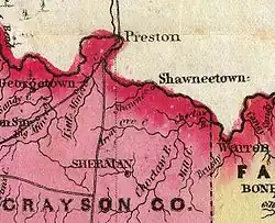 Preston developed in the area around Coffee's trading house and was a considerable town in 1845 when William H. Hunt completed its town plat survey.[9][12][13] The municipal government was established in 1851 with Tom Jackson as the first mayor.[13] Preston's Masonic lodge was established in 1852.[13] A United States post office was established in 1856,[13] and later a post office operated from 1880 to 1914.[12] Preston had general stores[12] and at least one blacksmith shop.[17]