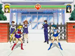 In the single-player mode, players can choose from nine playable Sailor Soldiers and fight against computer-controlled fighters across several locations from the series, although Sailor Saturn is not present in this title.[6][7] Each of these Soldiers has their own special attack set, as well as their own special moves that can be performed by inputting a combination of directional and button-based commands.[6] An easy difficulty mode allows players to execute special attacks with simple button presses while a normal mode requires more complex input combinations.[8] Similar to the Samurai Shodown franchise, the camera zooms in or out to maximize or minimize the level of graphical detail depending on character movement.[4]