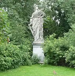 In 1936, the Free State of Prussia donated to the city of Berlin the sculpture Borussia, which had been created by the sculptor Reinhold Begas in 1855. The sculpture is about five meters high and was placed in the Prussian Park on a pedestal about two meters high. This shows the personification of Prussia in the form of a female figure with helmet, armor, sword and flowing robe. In 1980, the marble original was placed in the Lapidarium to protect it from environmental influences. A cast stone copy was installed on February 14, 1981.[11]