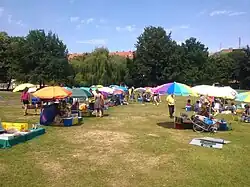 Sometime in the mid-1990s, the park's sunbathing lawn developed into a popular meeting place known as "Thaiwiese" ("Thai meadow"), for people of East Asian origin - mainly Thais, but also Filipinos, Chinese, Vietnamese and Laotians. They gather here in fine weather to meet friends and acquaintances and sell home-prepared food. This turned into a street food market that became known far beyond the Charlottenburg-Wilmersdorf district and is now mentioned in travel guides. The market was never approved, but grew anarchically out of the family reunion of Thai Berliners.[13] The sale and preparation of food is not allowed, so the official version is that Thai families picnic and visitors are kindly offered something.[14]