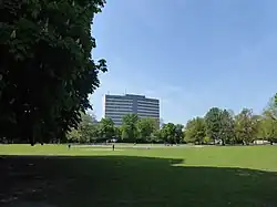 In the southern area, between Brandenburgische Straße and Württembergische Straße, the new building of the Wilmersdorf City Hall was planned. Around 1910, based on designs by the architect Otto Herrnring, a toilet house was built on the western edge of the park on Brandenburgische Straße, which has survived and is now a listed building.[4] After the town hall plans north of Fehrbelliner Platz were abandoned, the area was integrated into the park. The planning for this was done between 1920 and 1925, again by Richard Thieme. The oval of the large lawn, which still exists today, was joined by a broad axis to the south that led centrally to Fehrbelliner Platz. This was designed as an ornamental square between Hohenzollerndamm and Preußenpark.[5][6]