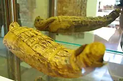 Other items on display include several related to mummification in ancient Egypt. One is a display of alabaster Canopic jars used for storing the internal organs of mummies that are in the shape of a gorilla.[5] Another is a mummy of falcon that dates back to 1500 BC.[5] This includes a casket, with the falcon wrapped up into the shape of Osiris, an Egyptian god.[1][10]