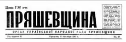 Priashevshchina (Пряшевщина) was a Russian language newspaper published from Prešov from March 18, 1945 to August 1951.[1][2][3] It was the organ of the Ukrainian People's Council of the Prešov Region, a pro-Soviet structure that appeared at the late stage of World War II.[2][3][4] Priashevshchina initially appeared semiweekly, later becoming a weekly.[2] Priashevshchina was the first newspaper for the Ruthenian/Ukrainian population in the area to appear after the liberation of the Presov region.[5][6] Chief editors of the newspaper were Ivan P'eščak and Fedor Lazoryk.[2][7] P'eščak, former parliamentarian of the First Czechoslovak Republic who had called for Rusyn national autonomy in the Prešov region after the Munich Agreement, had previously published the newspaper Priashevskaya Rus.[8]