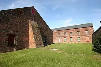 In 1804 the rolling way was covered over and additional structures were built alongside it: a foreman's office and a 'shoe room' (where workers were required to change into specialist clothing before entering the magazine). These structures, initially built in timber, were refaced in brick and roofed with slate after the end of the Napoleonic Wars.[3] In 1811 an office building was built to the south of the magazine, with a new cooperage alongside.