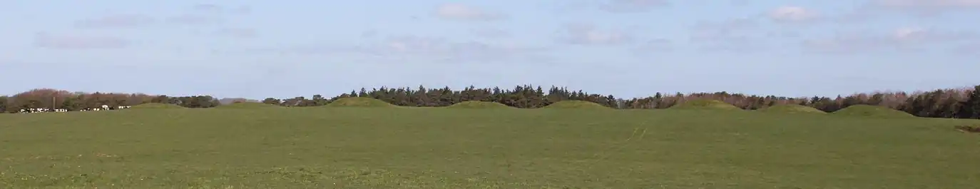 Ashen Hill Barrow Cemetery is the most northerly of the sites and consists of six bowl barrows and two bell barrows aligned east to west,[2] although :Lewes suggests that three may be bell barrows.[7] Each of the mounds is between 14 metres (46 ft) and 20 metres (66 ft) in diameter and rising to between 2 metres (6 ft 7 in) and 3 metres (9.8 ft) high. Each is surrounded by a ditch which has become infilled over time.[2] To the north and east of the barrows are further signs of excavations but these were related to lead extraction.