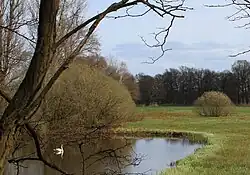 In 1833, Oppach, now almost completely deforested, was surveyed for separation. The rights of the neighboring villages (except Saathain) to use this area for purposes such as hunting, grazing, fishing, and the extraction of wood, clay, sand, or gravel were settled by the transfer of large areas. This also created new village boundaries, some of which were dead straight.[13] As a result of the division of the forest districts, the Prieschka estate acquired the Oppach and Kliebing estates. This increased its size considerably. The forest areas extended to the villages of Würdenhain, Saathain, and Reichenhain and bordered the villages of Oschätzchen and Zobersdorf. Prieschka alone received 276 morgen, 59 of which were the manor. At that time the forest was cut down and the land was reclaimed for fields and meadows. Shortly after, in 1849, the manor was abolished and in 1852, the first construction works for the regulation of the Black Elster began near the neighboring village of Zeischa, after the Prussian provincial government had tried to develop plans for this project since 1817. The river, which until then had consisted of numerous streams, was given its present bed and dammed in 1861. The Große Röder, which previously flowed into the Würdenhain, was diverted into the old Elster bed (Alte Röder) and flowed into the new course of the Schwarze Elster about six hundred meters northeast of the village of Prieschka at Gänsewinkel until the First World War.[20][21][22]