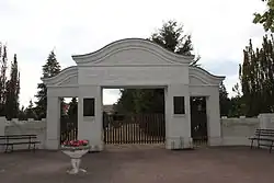The entrance portal of the Prieschka cemetery in Reichenhainer Street was designed in the form of a hero's gate. In the columns of the war memorial, which was inaugurated on June 7, 1925,[44] there are plaques with fifteen names of villagers who died in the First World War. To commemorate those who died or went missing in the Second World War, there are plaques with a total of fifty names on the left and right of the entrance to the Memorial Hall.[45]