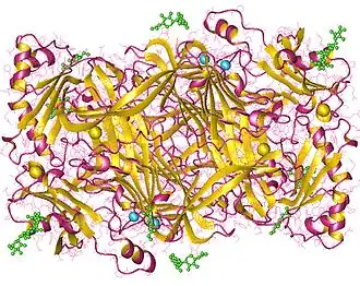 - ^ Wilce MC, Dooley DM, Freeman HC, Guss JM, Matsunami H, McIntire WS, Ruggiero CE, Tanizawa K, Yamaguchi H (Dec 1997). "Crystal structures of the copper-containing amine oxidase from Arthrobacter globiformis in the holo and apo forms: implications for the biogenesis of topaquinone". Biochemistry. 36 (51): 16116–33. doi:10.1021/bi971797i. PMID 9405045.