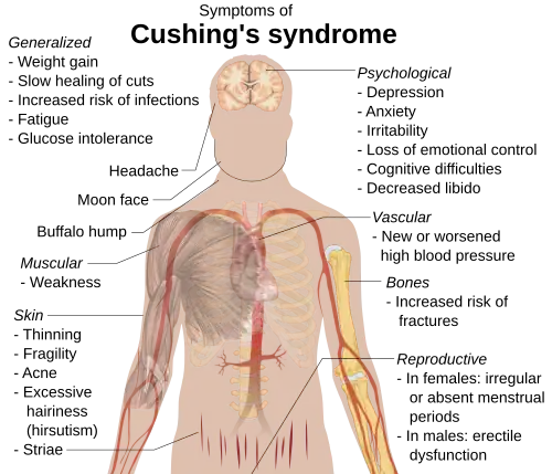 PPNAD is a rare cause of high cortisol levels in the blood and often manifests as ACTH-independent Cushing's syndrome.[2][3] The effects of PPNAD can often be cyclical so the symptoms of Cushing's syndrome will not always be as severe, which may complicate diagnosis.[4] The classic symptoms of Cushing's syndrome include rapid central weight gain, a puffy red face and a buffalo hump at the back of the neck due to fat deposits. Skin changes in Cushing's syndrome include thinning and bruising easily, developing striae and hyperpigmentation at skin folds. The hormonal changes can lead to hirsutism, males developing breast tissue, females no longer having periods and both sexes may become infertile. High cortisol levels can lead to psychological disturbances such as anxiety or depression and insomnia. Bone health can deteriorate, leading to an increased fracture risk in people with Cushing's syndrome.[5] PPNAD is unique as it often causes Cushing's at a young age, in children and adolescents.[3] In addition to the other symptoms of Cushing's syndrome, the patient may have a short stature due to interrupted growth because of ACTH suppression.[5]
