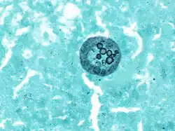 | Coccidioidomycosis in lung, endospores in spherule. | |