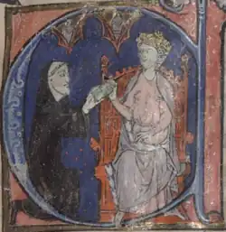 Primat's Old French chronicle, Roman des rois ("Romance of Kings"), was presented to Philip III in about 1274. It was probably commissioned by the king's father, Louis IX.[8] Primat's abbot, Matthew of Vendôme, also had a large role in its production and is a more imposing figure than the king in the original presentation miniature.[9] It was created by translating and adapting excerpts from various Latin histories in the archives of Saint-Denis.[8]