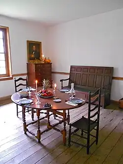 The house is furnished with much of its original furniture, including a settle bench that folds out into a bed. A table that Joseph bought from the old Chester Courthouse, the largest of its kind in the United States, still stands in the center hall of the house.[9] The name "Primitive Hall" was first recorded about 1846 but is believed to be much older.