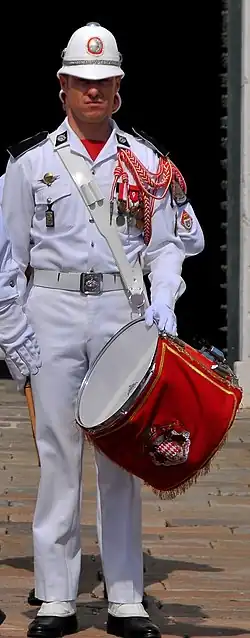 A medium-blue cloth helmet is worn, with plumes for gala occasions. White epaulettes, spats and aiguillettes that date back to the 19th century. In the summer, a white shirt is simply worn with a white helmet for drummers.[18] For ordinary duties a modern police style uniform is worn with a peaked cap replacing the helmet.[19]