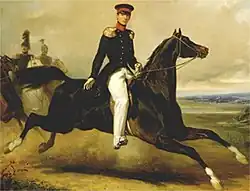 As the Prince of Orange's second son, Alexander was destined for a career in the army. On 2 August 1828, his tenth birthday, he received the rank of colonel by Royal Order. That same day his father gifted him his first horse. Alexander would prove to be a great horse lover and an expert horseman. As such, he was marked out for a career as a cavalry officer. He started his training at 20 years old in 1839 and spent part of it with the dragoons in Tilburg.[19] That same year his grandfather William I assigned him the rank of Major General and placed him at the head of the brigade of heavy cavalry stationed in Leiden. Alexander stayed in Leiden for one year only, until his father ascended the throne, promoted him to Lieutenant-General and assigned him the purely ceremonial role of Inspector-General of Cavalry. The Prince was very unhappy with this decision and for years to come would lament his inability to earn his stripes and be in real contact with the troops whose uniforms he was forced to wear.[20] Alexander never saw any action as a soldier. With his father and brother William, he joined the campaign against Belgium in 1833-4. but he was too young to actually participate in any fighting.[21] Although his position as Inspector of Cavalry was ceremonial, Alexander took it very seriously. Eliza Pieter Matthes, aide-de-camp to King William II, recalled a conversation he had with the Prince: "I had the impression he was quite knowledgeable about that weapon [the Cavalry]. It is a shame he is only our Inspector-General in name, we would not be worse off if he would be so effectively."[22] Prince Alexander held the position of Inspector-General from 1840 until his death. The Regiment Huzaren Prins Alexander was named for him.