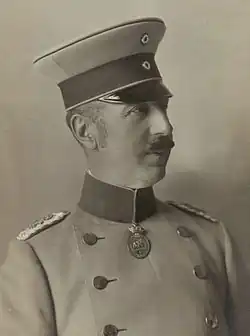 During World War I, Prince Aribert served on the staff of the 8th Infantry Division and as a battalion and regimental commander.[11] On 6 October 1914, he was promoted to Oberst à la suite of the army.[12] In October 1917, he took command of the 16th Infantry Brigade.[13] On 22 March 1918, he was promoted to Generalmajor à la suite of the army.[14]