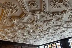 The main feature is the fine and rare highly decorated Jacobean plaster ceiling, with the Prince of Wales's feathers and the initials "PH" in the centre. There is one wall of original Jacobean wood panelling left; the other panelling is Georgian. The unexceptional fireplace has a wood surround and panelling above, with an inscription above recording the connection with the diarist and great naval administrator, Samuel Pepys. There are also fine leaded lights with coats of arms and badges, best seen from within the room.