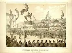 The ceremonial unveiling of the monument took place on 18 December [O.S. 6 December] 1882, on the day of Saint Nicholas, patron of the dynasty Obrenovic. The event was conceived as a large ephemeral spectacle on the occasion of the proclamation of the Kingdom of Serbia. At that time, a horseman without a hat was an unusual occurrence, and was noticed by the public.[7] Revealing of Monuments was a great spectacle, On the occasion of its unveiling, stage backdrops decorated with flowers, greenery, heraldic shields with a white double-headed eagles and flags, were set. On this occasion, Enrico Pazzi, as author of one of the most important Serbian monuments of the 19th century, received the Order of the Knight of Takovo, second degree. The ceremony was attended by the highest representatives of church, state and army and large numbers of the populace. Dignitaries included the prime minister Milan Piroćanac and ministers; National assembly's deputies; Dimitrije Nešić, rector of the Great School with its professors; president and members of the Serbian Learned Society; mayor of Belgrade Mihailo Karabiberović and city council members and delegates from throughout Serbia. The monument was unveiled when King Milan and Queen Natalija arrived.[8] The whole event was attended by the press of that time and above all by the "Serbian Newspapers". The ceremony was designed to demonstrate the power of the newly proclaimed Kingdom.[6]