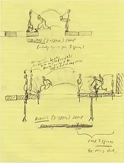 Prince of Persia was programmed in 6502 assembly, a low-level programming language.[11] Mechner used an animation technique called rotoscoping, with which he used footage to animate the characters' sprites and movements. To create the protagonist's platforming motions, Mechner traced video footage of his younger brother David running and jumping in white clothes.[12][13] To create the game's sword fighting sprites, Mechner rotoscoped the final duel scene between Errol Flynn and Basil Rathbone in The Adventures of Robin Hood.[10] Though the use of rotoscoping was regarded as a pioneering move, Mechner later recalled that "when we made that decision with Prince of Persia, I wasn't thinking about being cutting edge — we did it essentially because I'm not that good at drawing or animation, and it was the only way I could think of to get lifelike movement."[14] Also unusual was the method of combat: protagonist and enemies fought with swords, not projectile weapons, as was the case in most contemporary games. Mechner has said that when he started programming, the first ten minutes of the film Raiders of the Lost Ark had been one of the main inspirations for the character's acrobatic responses in a dangerous environment.[9]