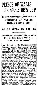 - ^ "Prince of Wales Sponsors New Cup: Trophy Costing $2,500 Will Be Emblematic of National Hockey League Title". New York Times. December 7, 1925. p. 26.