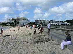 Arriving aircraft approach the island on the last section of the final approach for Runway 10, following a 3° glide slope flying low over the famous Maho Beach. The proximity of Maho Beach to the runway has made the airport one of the world's favorite places among planespotters despite the dangers.[16] In 2017 a New Zealand woman died from injuries sustained by jet blast from a departing aircraft.[17] Tourists have been often criticised for dangerous behavior on the beach.[18]