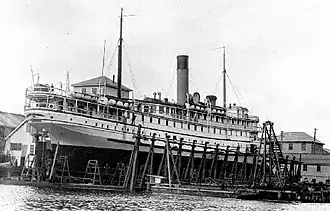 Princess Royal was built in 1907 by the B.C. Marine Railway Company, Ltd., at Esquimalt, British Columbia.[2] Princess Royal was the second ship built for the CPR Coast Service by B.C. Marine Railway Co.[3] (The first was Princess Beatrice.) Princess Royal, like Princess Beatrice, was built of wood.[1] The ship's dimensions were 228 feet (69 m) long, 40-foot (12 m) beam, 17-foot (5.2 m) depth of hold, and 1997 gross tons. The ship had a single propeller. The power plant had a single triple-expansion steam engine, with cylinder diameters, from high to low steam pressure, of 22, 35 and 60 inches (1,500 mm). Bore stroke on all cylinders was 36 inches (910 mm).[2] This power plant, manufactured by Bow, McLachlan and Co. of Paisley, Scotland generated 1600 horsepower.[4][5] The ship's speed maximum speed was 15 kn (28 km/h).[6] Princess Royal had 72 staterooms with 144 berths.[3] The ship's Canadian registration number was 121988.[5]