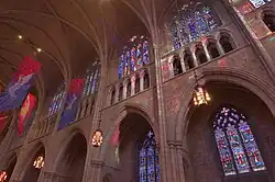 The northern transept is named for Henry Gurdon Marquand, the benefactor of the Marquand Chapel, which burned to the ground in 1920 and which the present chapel was built to replace.[48] An American flag flown by the USS Princeton hangs from the transept's north wall.[49] The southern transept is named for Chester Alwyn Braman, the first donor to the University Chapel Fund. A staircase leads from the Braman Transept to the Bright Pulpit.[50]