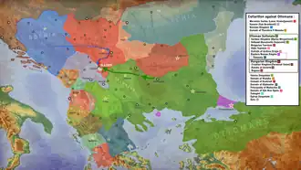 Stefan Lazarević participated as an Ottoman vassal in the Battle of Karanovasa in 1394, the Battle of Rovine in 1395, the Battle of Nicopolis in 1396, and in the Battle of Angora in 1402. After Angora, he visited Constantinople, the capital city of the Byzantine Empire, where he was given the title of Despot, and since then his state became known as the Serbian Despotate in 1402.[16][17]