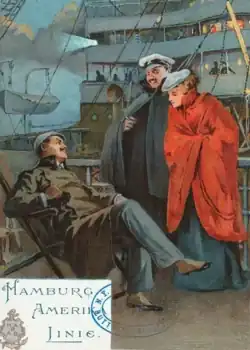 On 5 January 1901 Prinzessin Victoria Luise left Hamburg on her maiden voyage. She called at Boulogne and Plymouth, and reached Hoboken, New Jersey on 17 January. At first, her cruises were sometimes called "tours".[4] On 26 January she left New York on her first tour, which was to Port-au-Prince; Santo Domingo; San Juan; St Thomas, in what were then the Danish West Indies; Saint-Pierre; Port of Spain; La Guaira: Puerto Cabello; Curaçao; Kingston; Santiago de Cuba; Cienfuegos; and Havana.[5] She arrived back in Hoboken on 2 March.[6] On 9 March she left Hoboken on a her second tour,[7] which was to the Mediterranean and the Black Sea.[4] On 18 June she attended a Norddeutscher Regatta Verein regatta on the Elbe at Cuxhaven, where she hosted a dinner at which Wilhelm II gave a speech in which he praised Ballin as "a bold adventurer to make peaceful conquests, whose fruits our grandchildren will reap". The Kaiser also presented a portrait of himself to Ballin, bearing the dedication "to the farseeing and tireless pathbreaker for our German commerce and export".[8]