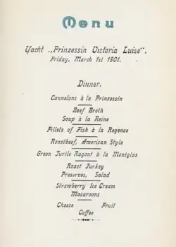 After she was fitted out, Wilhelm II inspected the ship. He was said to be displeased that she was slightly longer than his imperial yacht Hohenzollern.[1] HAPAG registered Prinzessin Victoria Luise at Hamburg. Her code letters were RLVT.[2]