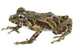 Adult males measure 19–28 mm (0.7–1.1 in)[6][7] and adult females 24–33 mm (0.9–1.3 in) in snout–vent length (SVL).[2][5] The snout is rounded in dorsal view and moderately long. The tympanum is half-concealed by the well-developed supratympanic fold. The fingers and the toes have large discs at their tips and vague (fingers) or narrow (toes), weakly crenelate lateral keels. Skin is dorsally finely tuberculate and ventrally areolate.[2] The dorsal coloration varies from green to greenish brown with darker brown markings. The belly is white, sometimes with brown fringes. The groin and posterior surfaces of the thighs are deep blue to dark brown, sometimes with orange spots on the edges. The iris is pale yellow with black reticulation.[4]