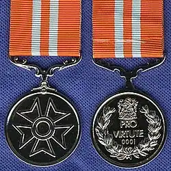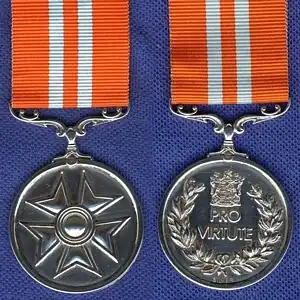 The Pro Virtute Medal, post-nominal letters PVM, was a military decoration for bravery that was instituted by the Republic of South Africa in 1987, but never awarded. The decoration was intended for award to other ranks of the South African Defence Force for distinguished conduct and outstanding combat leadership in the field.[1][2]