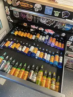 Early tattoo inks were obtained directly from nature and were extremely limited in pigment variety. In ancient Hawaii, for example, kukui nut ash was blended with coconut oil to produce an ebony ink.[2] Today, an almost unlimited number of colors and shades of tattoo ink are mass-produced and sold to parlors worldwide. Tattoo artists commonly mix these inks to create their own unique pigments.