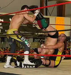 Two wrestlers throw a single opponent up into a flapjack. In this move both wrestlers push the opponent upward by reaching under their legs and lifting them into the air. While keeping the hold on the opponent’s legs the wrestlers fall backwards, dropping the opponent front-first into the canvas. Another basic double flapjack is similar to a back drop, in which the wrestlers push the opponent upwards and release them so that they fall onto their face instead of falling back-first.