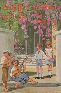 Herbert and Suse, affectionately known as “Bubi” and “Mädi”, are the heroes of the five-volume series Professor’s Twins by Else Ury. Their father, Professor Winter, an astronomer, was transferred to Naples and after a year of separation the family reunites under the southern sun in volume 3, Professor’s Twins in Italy, the most popular volume, published 1927. Bubi and Mädi quickly adapt to their new surroundings, learn the language and attend school separately for the first time.[1]