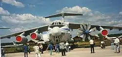 A single prototype of the D-27 engine was used for flight testing on an Ilyushin Il-76 modified as a testbed aircraft since at least 1992, in preparation for use on the Antonov An-70T military transport aircraft. The version of the D-27 for the An-70T produced 13,800 hp (10,290 kW)[11] and now had 4.5 m diameter (14 ft 9 in) propellers.[12] In 1993, the Il-76LL testbed with D-27 engine was put on static display at Moscow's MAKS Air Show, and the next year it flew at the ILA Berlin Air Show and the Farnborough Air Show. The testbed configuration made a final appearance at the MAKS Air Show in 1997.[13]