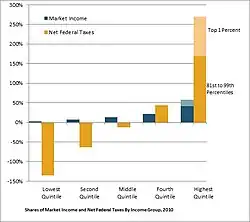 The Tax Foundation produced a similar breakdown for 1991 to 2004. Its computation of comprehensive household income consisted of both market-based income and the net value of government transfer payments, the latter are not part of the CBO's definition. In this report the top quintile earned 41.5% and paid 48.8% of total taxes. The fourth quintile earned 21.0% and paid 22.4%. The third quintile earned 15.4% and paid 14.8%. The second quintile earned 12.2% and paid 9.6%. The lowest quintile earned 9.8% and paid 4.3% of total taxes.[21]