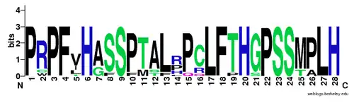 PRR21 consists of 389 amino acids or 1170 base pairs, all found within one exon. Like other proline-rich proteins, it contains a repeated sequence of amino acids that contains several proline residues.[4] The tandemly repeated sequence of PRR21 is 28 amino acids long and is repeated in full 11 times, with few variations. A logo displaying the variances of the repeat is shown below.[5] The repeat constitute almost the entire protein, except for the very beginning and a short tail.