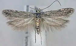 The wingspan is 17-20.5 mm. There are streaks of gray white between brown on the veins of the forewings and the outer margin has dark brown at the ends of the veins. The scales of the cilia are gray white, the apex of each scale pale brown. The hindwings are fuscous.[3]
