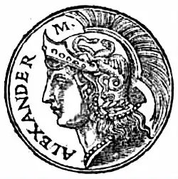 The remaining portraits in the book were derived from a diverse array of source materials. Rouillé and the engraver responsible drew upon paintings,[3] earlier published portrait books,[5]: 99 as well as select numismatic, sigillographic, and intaglio collections available to them.[10]: 259 Their interpretation of numismatic imagery led to several documented errors. For example, they based the portrait of Alexander the Great on the obverse of a Macedonian gold stater depicting the goddess Athena, mistakenly identifying her depiction as that of the Macedonian ruler.[16] Another misattribution involved identifying Rhodian silver didrachms as the thirty pieces of silver given to Judas Iscariot for his betrayal of Christ,[g] reflecting a widespread medieval belief. Conversely, Rouillé and the engraver accurately employed numismatic imagery for the portrayals of Demetrius I Poliorcetes and Mithridates VI Eupator.[5]: 101 The portraits of French monarchs were reproduced from two sources: Les Anciennes et modernes genealogies des Roys de France ('The ancient and modern genealogies of the Kings of France'), a 1528 work by French poet and historian Jean Bouchet,[14]: 704–705 and Epitome gestorum LVIII regum Franciae ('Epitome of the deeds of the 58 kings of France'), published in 1546 by Lyonnais bookseller Balthazar Arnoullet.[5]: 99 Most of the early Caesars' portraits were sourced from Imperatorum et Caesarum vitae ('Lives of Emperors and Caesars'), a 1534 work by German historian Johannes Huttich.[5]: 101