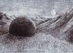 Other prophetic statements are presented as accounts of dreams and visions.[2] Amy Amendt-Raduege writes that Tolkien was "follow[ing] the same conventions" as the common medieval literary device of dream vision or visio.[3] This allows readers to pass over them as "interesting detail[s]", but to reflect on them in the light of later events.[2] One such is Frodo's exclamation to Gandalf "I saw you!" when Gandalf narrates his rescue from the top of Orthanc by the Gwaihir the Eagle. Gandalf is "astonished". Another is Tom Bombadil's account of the Men of Westernesse who forged the daggers he gave to the Hobbits. The Hobbits "did not understand his words, but as he spoke they had a vision as it were of a great expanse of years behind them, like a vast shadowy plain over which there strode shapes of Men, tall and grim with bright swords, and last came one with a star on his brow."[T 8] A third dream, the "most prominent",[2] is the one shared by Boromir and Faramir, in which they hear the eight lines of verse forming a riddle that Boromir travels to the Council of Elrond to solve:[T 5]