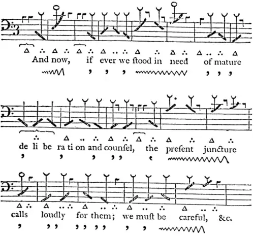 In 1774 James Burnett, Lord Monboddo published the second of 6 volumes of his On the Origin and Progress of Language containing, among much else, a section dealing with "language considered as sound".[4] Sir John Pringle (then president of the Royal Society) asked Joshua Steele to respond to some of Monboddo's statements,[5] particularly the statement: