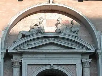 He was prolific in his native Reggio Emilia, where he left in a bronze tabernacle; and a monument of Bishop Rangone (Rangoni) in 1567, for which, after five years, he was handsomely paid 1250 gold scudi. He complete a monument for Bishop Filippo Zoboli (1554) in San Nicolò of Reggio Emilia, which is flanked by grieving maidens. Algarotti extolled him as the "Correggio of sculpture".[3] William Waters, less kindly, called his works "some of the worst sculpture of the time..monstrous..and absurdity".[4] For the Cathedral of Reggio Emilia, he completed a Christ with the Cross and statues of St Grisanto and St Daria outside west door, while over the main portal, he had statues of a recumbent Adam and Eve (1552–1557). He also completed statues of Lepidus and Hercules at Modena, the statue of St Procolo for the Volta tomb at Bologna, and a recumbent Figure of Alberto Pio del Carpi in the Louvre.[5]