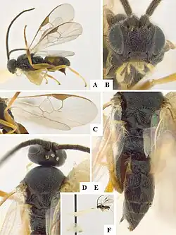 | Protapanteles phlyctaeniae, A. Habitus, B. Head, C. Wings, D. Head and mesosoma, E. Mesosoma (partially) and metasoma, F. Glued specimen and cocoon | |