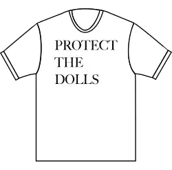 He proceeded to create the original shirt the night before the show, finding a deadstock white T-shirt and using heat-transfer paper to print "Protect the Dolls" in all caps, taking two to three minutes to do so.[5] The slogan appears in black in the Big Caslon serif typeface in all caps and is left-justified.[1]