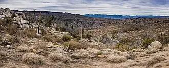 | Kiavah Wilderness | Kern County | 1994 | 88,290 acres (137.95 sq mi; 357.3 km2)[45] | 5,000–7,294 ft (1,500–2,223 m)[22] | The Scodie Mountains, a low mountain range located at the far southeasternmost extent of the Sierra Nevada, are protected by this wilderness area. These mountains are quite arid, generally receiving only 10 to 15 inches of rainfall-equivalent precipitation per year. As a result, this area contains features of both the Sierra Nevada and Mojave Desert ecosystems, forming a sort of transition zone at the edge of the desert. The driest locations are home to desert vegetation such as sagebrush, creosote, and Joshua trees, and the bajadas at the foot of the mountains are home to desert animals including numerous lizards and the yellow-eared pocket mouse. In areas that receive somewhat greater rainfall, vegetation common to the drier parts of the Sierra, such as pinyon, juniper, canyon oak, and grey pine predominate.[46] | |