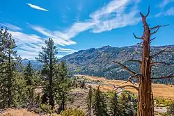 Mono, Alpine, Sierra, Nevada, Lassen, and El Dorado counties, California; Mineral, Lyon, Washoe, and Douglas counties and Carson City, Nevada | 1995 | 1,600,000 acres (2,500.0 sq mi; 6,475.0 km2)[12][l] | 4,500–12,374 ft (1,372–3,772 m)[13][14][11][m] | Two districts of this highly dispersed national forest protect a long stretch of the steep, rugged eastern slope of the Sierra Nevada. The terrain ranges from the stark granite peaks and basins along the crest, to lush green valleys and forested mountains further down the eastern slope, to scrubby arid ranges located to the east of the Sierras. The forest also protects Nevada's Carson Range, a spur of the Sierra Nevada along the east shore of Lake Tahoe. |